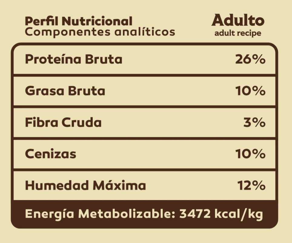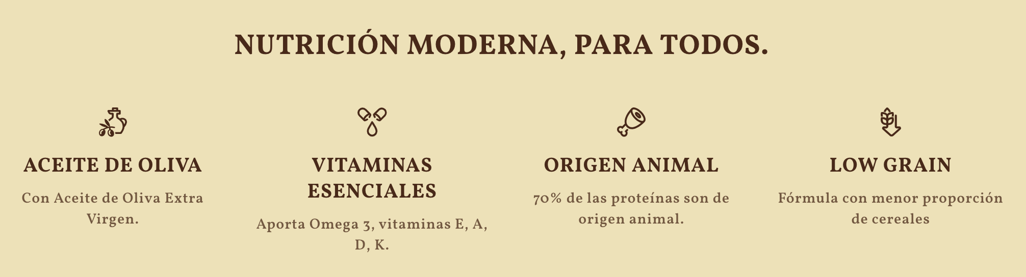Proteína de carne deshidratada, maíz, afrechillo, harina de trigo, arroz, aceite de oliva, aceite de pollo, saborizantes hidrolizados de ave, zeolitas, sal, Omega 3 y Omega 6, extracto Yuca Shidigera, probióticos, antihongos, secuestrante de micotoxinas, colorante natural, aromas, saborizantes.