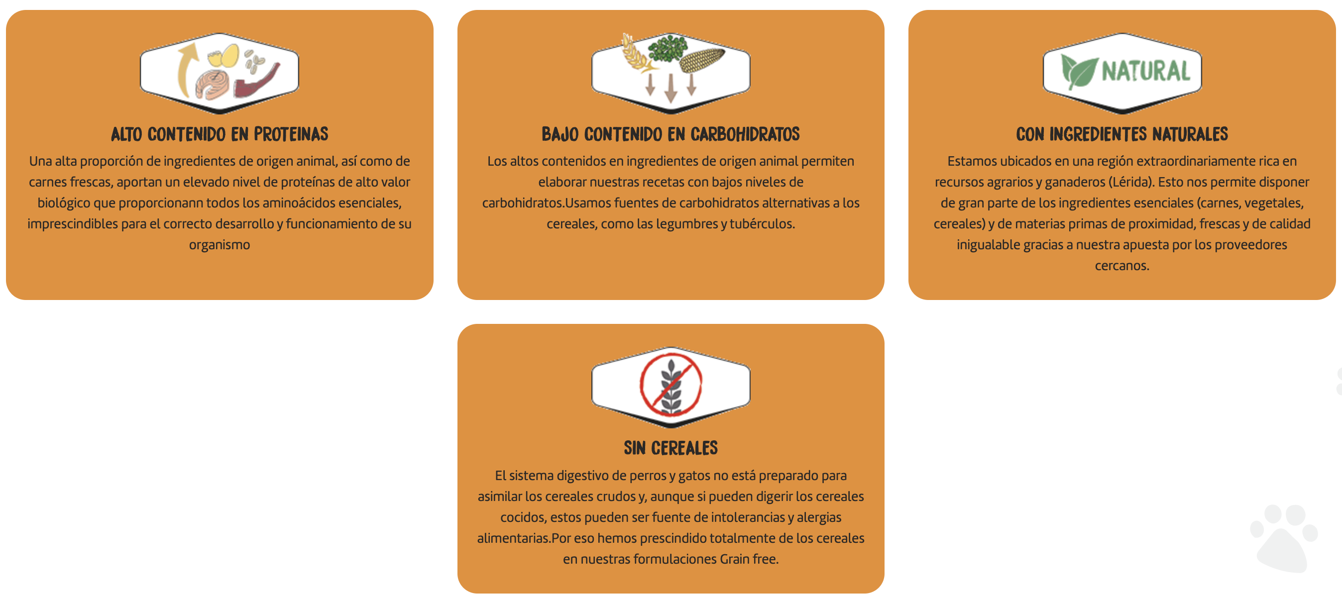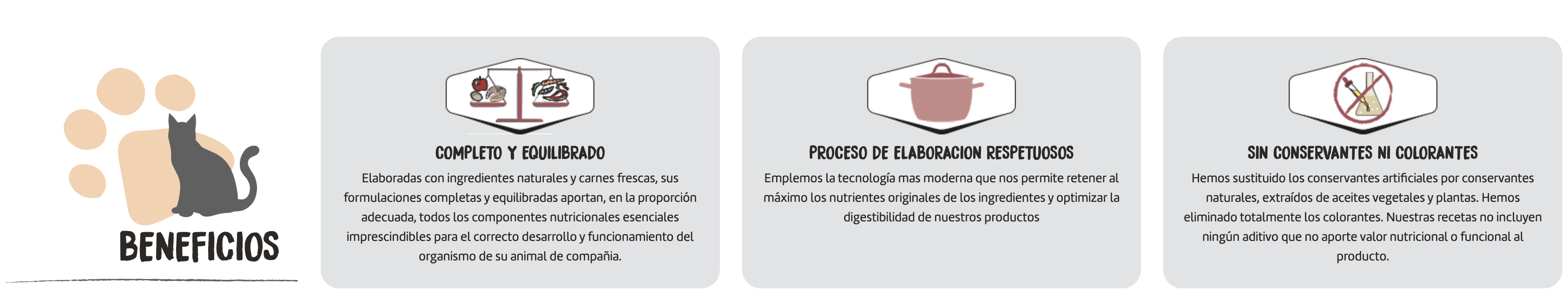 Vitamina A 25.000 UI, vitamina D3 1.500 UI, vitamina E 425 UI, vitamina C 100 mg, taurina 2.000 mg, L-carnitina 200 mg, cobre (sulfato de cobre (II) pentahidratado) 5 mg, cobre (quelato de cobre (II) de aminoácidos hidratado) 5 mg, manganeso (óxido de manganeso (II)) 52 mg, zinc (óxido de zinc) 100 mg, hierro (sulfato de hierro (II) monohidratado) 40 mg, zinc (quelato de zinc de aminoácidos hidratado) 10 mg, yodo (yoduro de potasio) 4 mg, selenio (selenito sódico) 0,3 mg, kcal/kg 3.800.Con antioxidantes naturales.
