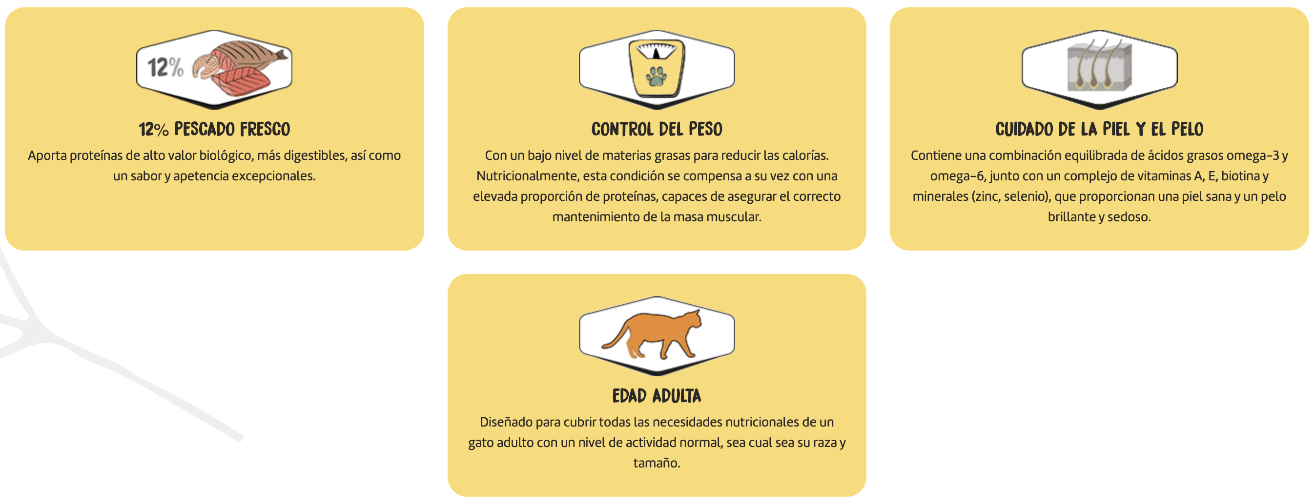 Comida para gatos. Especialmente formulado para satisfacer las necesidades nutricionales de los gatos adultos esterilizados y mantener su peso ideal. Contiene un 12% de pescado fresco, aportando proteínas de alta calidad, un sabor irresistible y un alto contenido en omega 3 que ayuda a mantener la piel sana y el pelo sedoso y brillante.