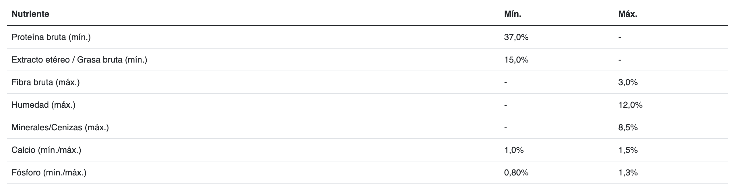 Carne de pollo congelada, gluten de maíz, harina de subproductos de pollo, maíz, trigo, aceite de pollo y/o grasa vacuna preservados con tocoferoles (fuente de vitamina E), aceite de pescado y/o harina de alga (Schizochytrium sp.), hidrolizado (polvo y/o líquido) a base de subproductos de pollo y/o cerdo, inulina, ácido fosfórico y/o bisulfato de sodio, cloruro de potasio, arroz, gluten de trigo, pulpa de remolacha, carbonato y/o fosfato cálcico, L-arginina, suplemento vitamínico antioxidante (A, D3, E, K3, B1, B2, B3, B5, B6, B7, B9, B12, BHT), sal, L-lisina, cloruro de colina, suplementos minerales [(sulfatos: zinc, hierro, manganeso, cobre), (proteinatos: zinc, hierro, manganeso, cobre, selenio), yodato de calcio, selenito de sodio], beta-caroteno, taurina, DLmetionina, levadura seca (Saccharomyces cerevisiae ssp.), ácido ascórbico (fuente de vitamina C).