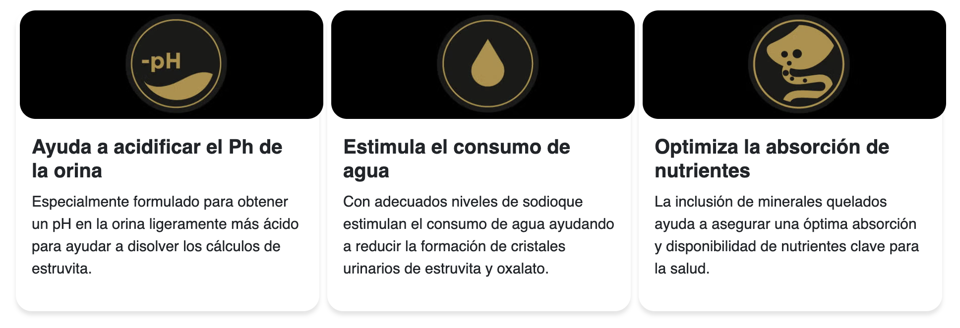 Combinación exclusiva de nutrientes que ayuda a mantener un ambiente desfavorable para el desarrollo de cristales de estruvita y oxalato, manteniendo y protegiendo la salud del tracto urinario inferior de los gatos adultos.
