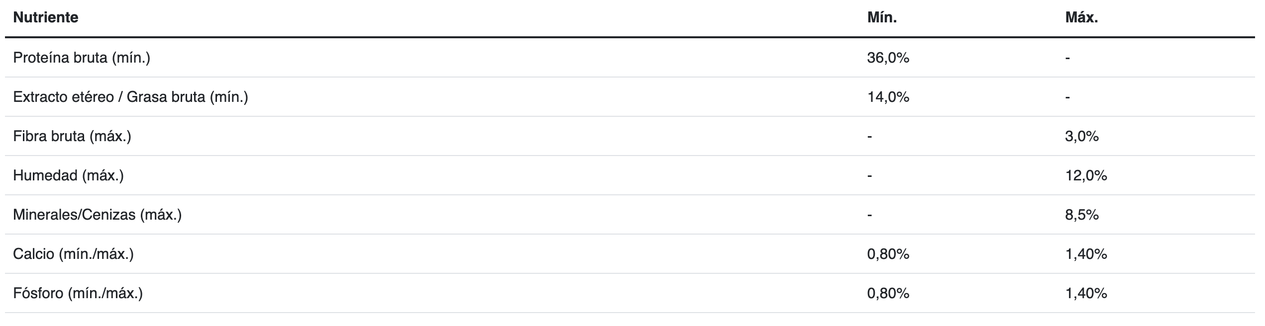 Gluten de maíz, arroz, harina de subproductos de pollo, carne de pollo congelada, maíz, aceite de pollo y/o grasa vacuna preservados con tocoferoles (fuente de vitamina E), trigo, hidrolizado a base de subproductos de pollo y/o cerdo, ácido fosfórico y/o bisulfato de sodio, fibra de soja, sal, carbonato y/o fosfato cálcico, cloruro de potasio, pirofosfato tetrasódico, cloruro de colina, aceite de pescado y/o harina de alga (Schizochytrium sp.), suplemento vitamínico antioxidante (A, D3, E, K3, B1, B2, B3, B5, B6, B7, B9, B12, BHT), taurina, levadura seca (Saccharomyces cerevisiae ssp.), suplementos minerales [(sulfatos: zinc, hierro, manganeso, cobre), (proteinatos: zinc, hierro, manganeso, cobre, selenio), yodato de calcio, selenito de sodio], L-lisina, DL-metionina, ácido ascórbico (fuente de vitamina C).