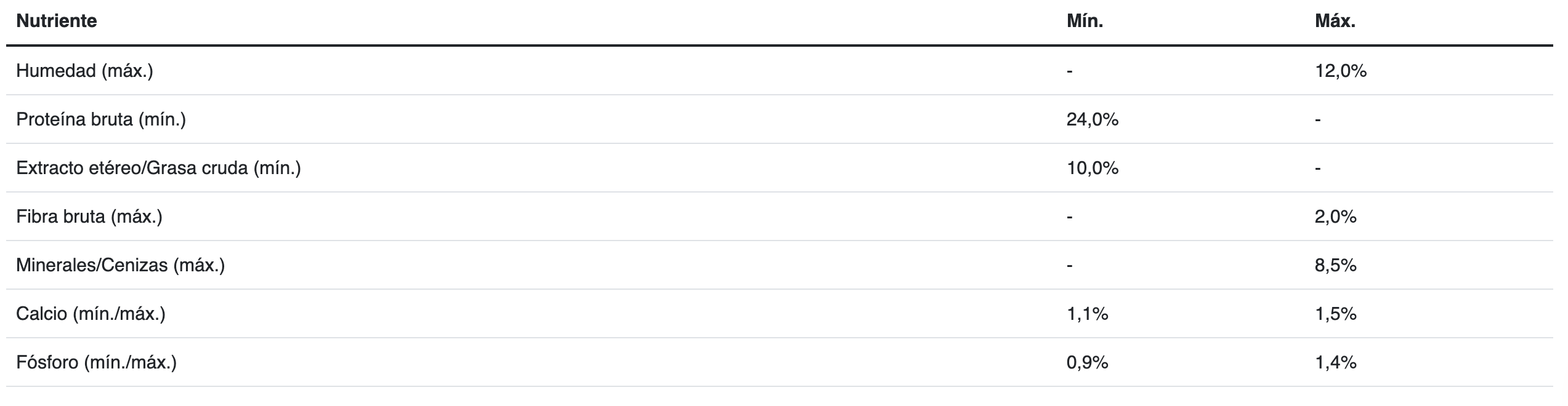 Arroz, maíz, gluten de maíz, harina de subproductos de pollo, aceite de pollo y/o grasa vacuna preservados con tocoferoles (fuente de vitamina E), carbonato de calcio y/o fosfato de calcio, carne de pollo congelada, aceite de coco, bicarbonato de sodio, cloruro de potasio, hidrolizado (polvo y/o líquido) a base de subproductos de pollo y/o cerdo, levadura seca (Saccharomyces cerevisiae), aceite de pescado y/o harina de alga (Schizochytrium sp.), suplemento vitamínico antioxidante (A, D3, E, K3, B1, B2, B3, B5, B6, B7, B9, B12, BHT), inulina y/o fructooligosacáridos y/o pared celular de levadura (fuente natural de manano-oligosacáridos y betaglucanos), L-lisina, sal, pirofosfato tetrasódico, sorbato de potasio, aceite de girasol, suplementos minerales [(sulfatos: zinc, hierro, manganeso, cobre), (proteinatos y/o glicinatos: zinc, hierro, manganeso, cobre, selenio), yodato de calcio, selenito de sodio], cloruro de colina, calostro bovino en polvo (fuente natural de anticuerpos), DL-metionina, L-treonina, ácido ascórbico (fuente de vitamina C), L-triptófano.