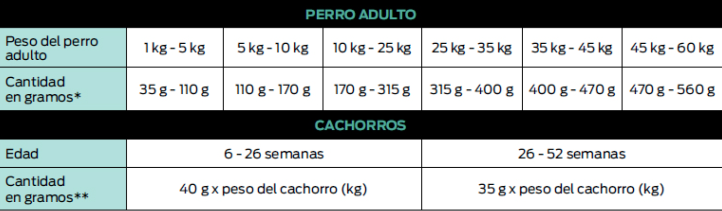 **La cantidad para cachorros debe considerar el peso real del perro y su edad. Dividir la cantidad total a ser ofrecida en por lo menos dos raciones.
