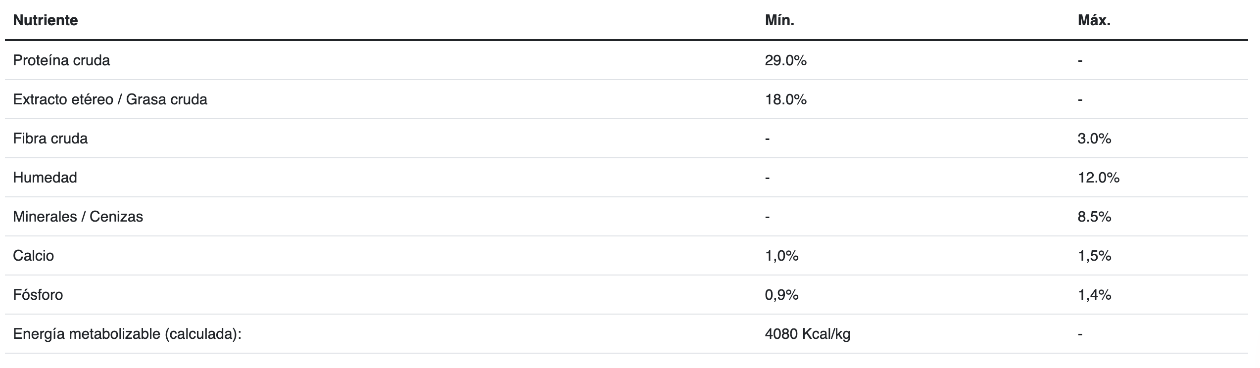 Carne de Pollo congelada, maíz, harina de subproductos de pollo, trigo, gluten de maíz, aceite de pollo y/o grasa vacuna preservados con tocoferoles (fuente de vitamina E), hidrolizado a base de subproductos de pollo y/o cerdo, arroz, huevo en polvo, sal, carbonato y/o fosfato cálcico, pulpa de remolacha, cloruro de potasio, zeolita, aceite de pescado y/o harina de alga (schizochytrium sp.), sorbato de potasio, suplemento vitamínico antioxidante (A, D3, E, K1, B1, B2, B3, B5, B6, B7, B9, B12, BHT), suplementos minerales [(sulfatos: zinc, hierro, manganeso, cobre, magnesio), (proteinatos: zinc, hierro, manganeso, cobre, selenio), yodato de calcio, selenito de sodio], cloruro de colina, pared celular de levadura Saccharomyces cerevisiae (fuente de manano-oligosacáridos y betaglucanos), butirato de calcio, calostro bovino en polvo (fuente natural de anticuerpos), DL_metionina, ácido ascórbico (fuente de vitamina C), L-lisina, L-triptófano, L-treonina.