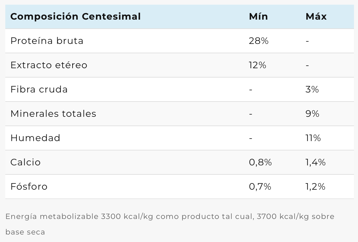 Harina de carne y hueso de cordero, arroz, arvejas, gluten meal, aceite de pollo, pulpa de remolacha, hidrolizado de vísceras de pollo, aceite de pescado, levadura de cerveza, zeolita, sal, inulina, extracto de Yucca schidigera, polifenoles, ácido propiónico, paredes de levadura, antioxidantes naturales (extracto de romero, lecitina, tocoferoles), glucosamina, metilsufonilmetano, nucleótidos de levadura, hexametafosfato de sodio. Vitaminas: A, D3, E, K3, B1, B2, B6, B12, colina, biotina, ácido fólico, ácido nicotínico, ácido pantoténico, vitamina C. Minerales: yodo, hierro, manganeso, cobre, selenio y zinc.