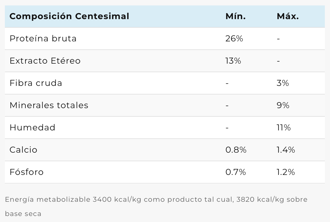 Harina de carne y hueso de cerdo, arroz, arvejas, gluten meal, aceite de pollo, pulpa de remolacha, hidrolizado de hígado porcino, aceite de pescado, levadura de cerveza, zeolita, sal, inulina, extracto de Yucca schidigera, antioxidantes naturales (extracto de romero, lecitina, tocoferoles), polifenoles, ácido propiónico, paredes de levadura, glucosamina, metilsufonilmetano, nucleótidos de levadura, hexametafosfato de sodio. Vitaminas: A, D3, E, K3, B1, B2, B6, B12, colina, biotina, ácido fólico, ácido nicotínico, ácido pantoténico, vitamina C. Minerales: yodo, hierro, manganeso, cobre, selenio y zinc.