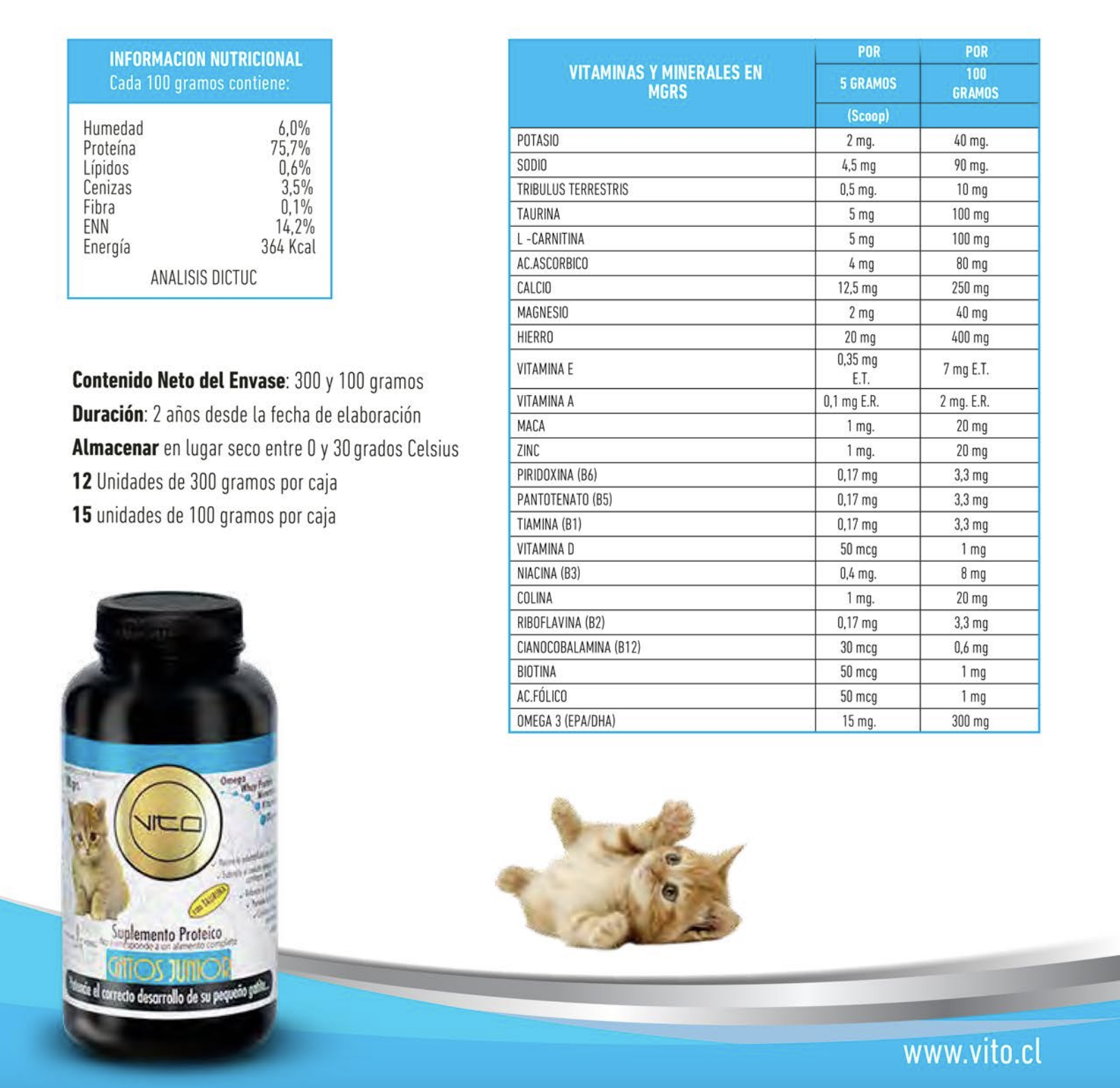 VITO Junior es un novedoso complemento proteico para tu gato que, al agregarlo al alimento acostumbrado (pellets o comida) lo transforma en un completo banquete, mejorando su sabor y la calidad nutricional de manera significativa durante su desarrollo en crecimiento.
