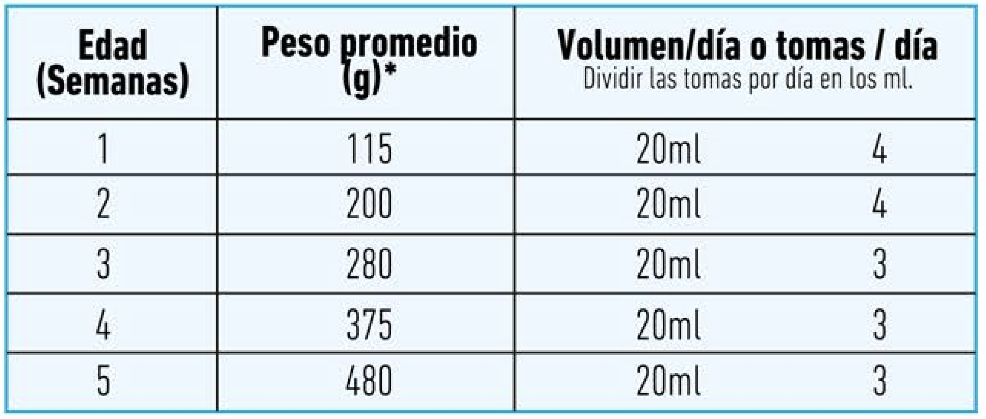 4 cucharaditas de té (20 ml) por cada 100gr. de pesoal día o según indicación del Médico Veterinario. Encachorros de 0 a 2 semanas se sugiere alimentar 4veces al día; dividiendo el volumen total en 4 tomas;y en cachorros mayores alimentar 3 veces al día.