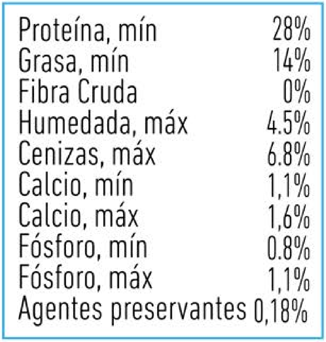 Proteína concentrada de suero, leche entera de polvo, maltodextrino, huevo deshidratado, carbonato de calcio, taurina, carboximetilcelulosa, ácido ascórbico, sulfato de zinc, sulfato de magnesio, sulfato ferroso, sorbato de potasio, goma axantica y oxido de silicio.