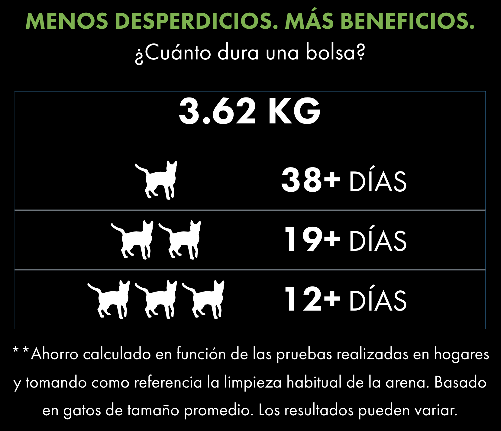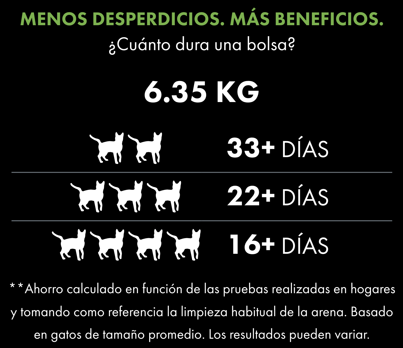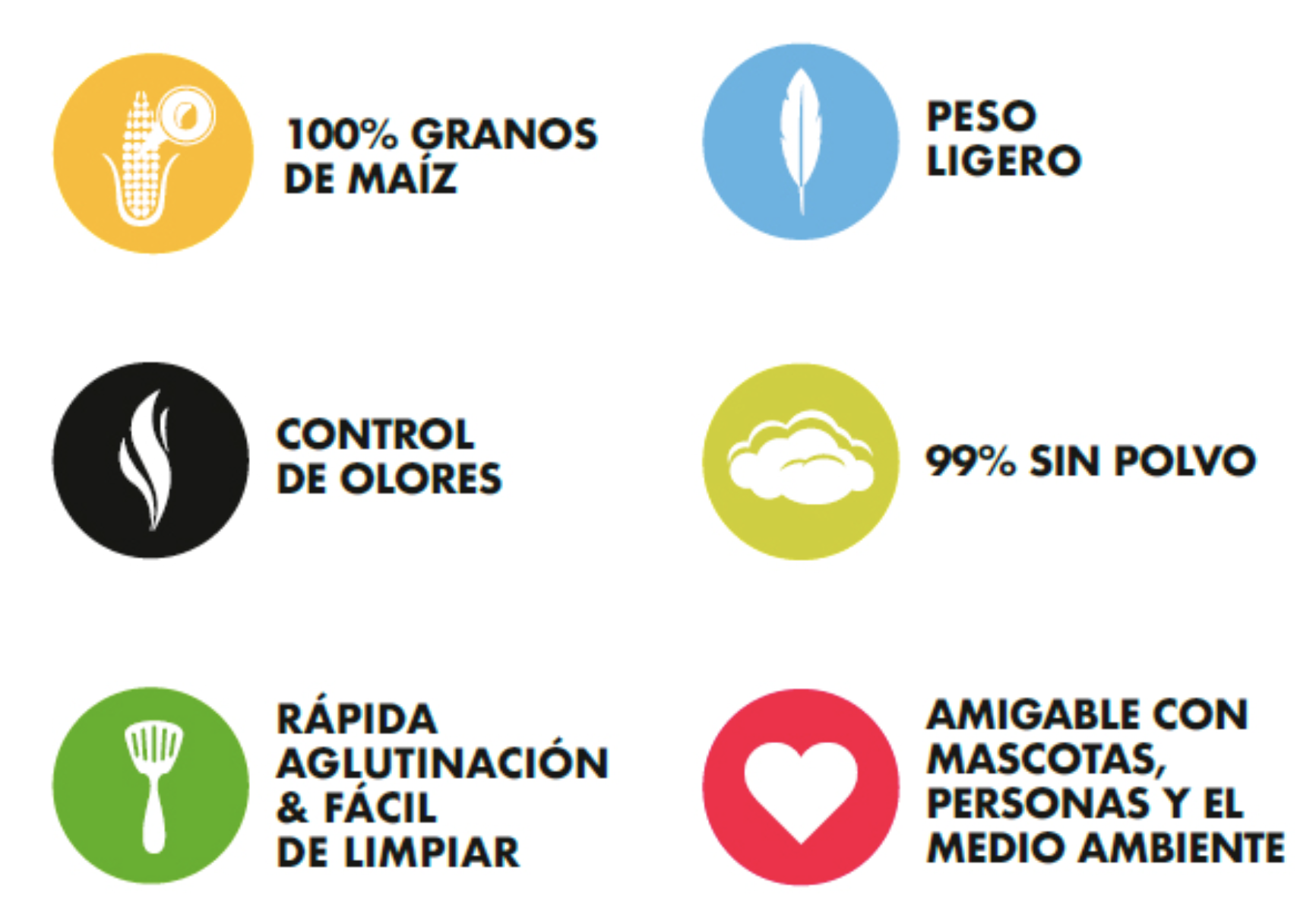 Utiliza un proceso patentado para comprimir el maíz en gránulos naturalmente absorbente y concentrados que atrapan el olor profundo en el interior y forman grupos apretados al contacto, para que pueda absorber más y desperdiciar menos. 100% Natural - 110% Rendimiento.